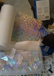 | Glasset må skjæres og stables sammen, gjerne med litt hurtiglim for å holde alt på plass.... Det trengs et bakgrunnsglass, noen lag med dichroicglass og et toppglass... Legg merke til plasteret i bakgrunnen.. |